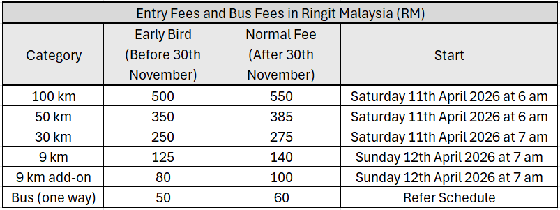 Please note that the return buses will not run through the night between Saturday and Sunday due to safety concerns and past experience. The last bus to Kota Kinabalu will leave around 12 am on Saturday. All 30k and 50k competitors should be able to catch the buses back to Kota Kinabalu on Saturday, unless they want to camp overnight and take part in the 9 km race the next morning or support 100k runners coming to the finish line.
