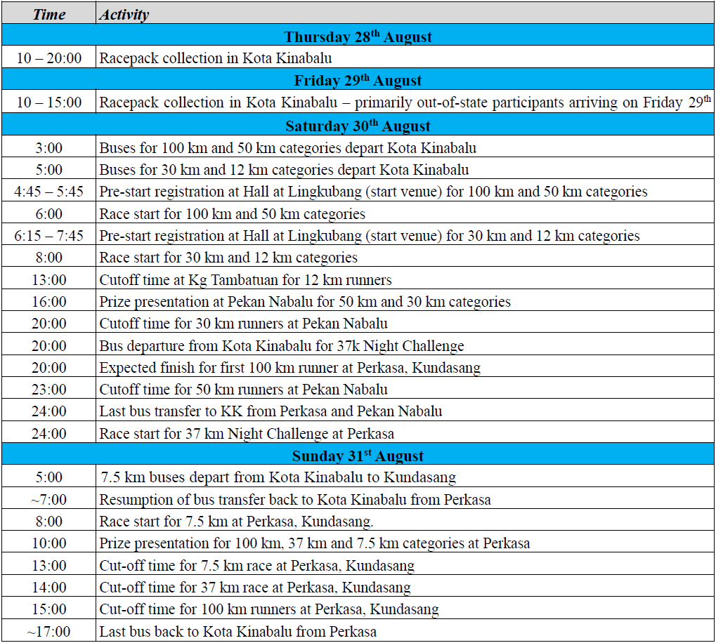 - 28-29 August: Race Pack collection Kota Kinabalu