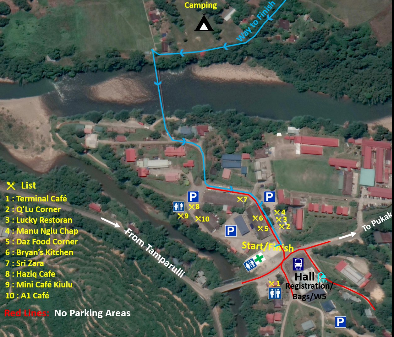 - Do not block traffic at Kiulu – follow instruction to park efficiently and proceed to the Dewan for registration. A map of parking areas is provided below - no parking is allowed along the roads leading into to the start/finish area to avoid blocking the route and access points.
