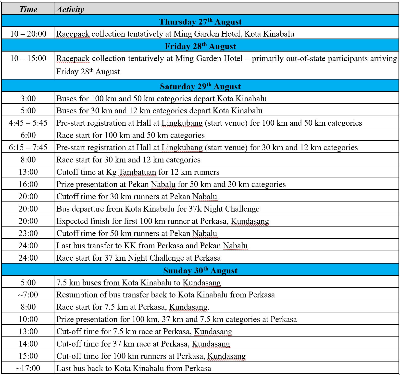 - 27-28 August: Race Pack collection Kota Kinabalu